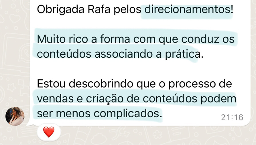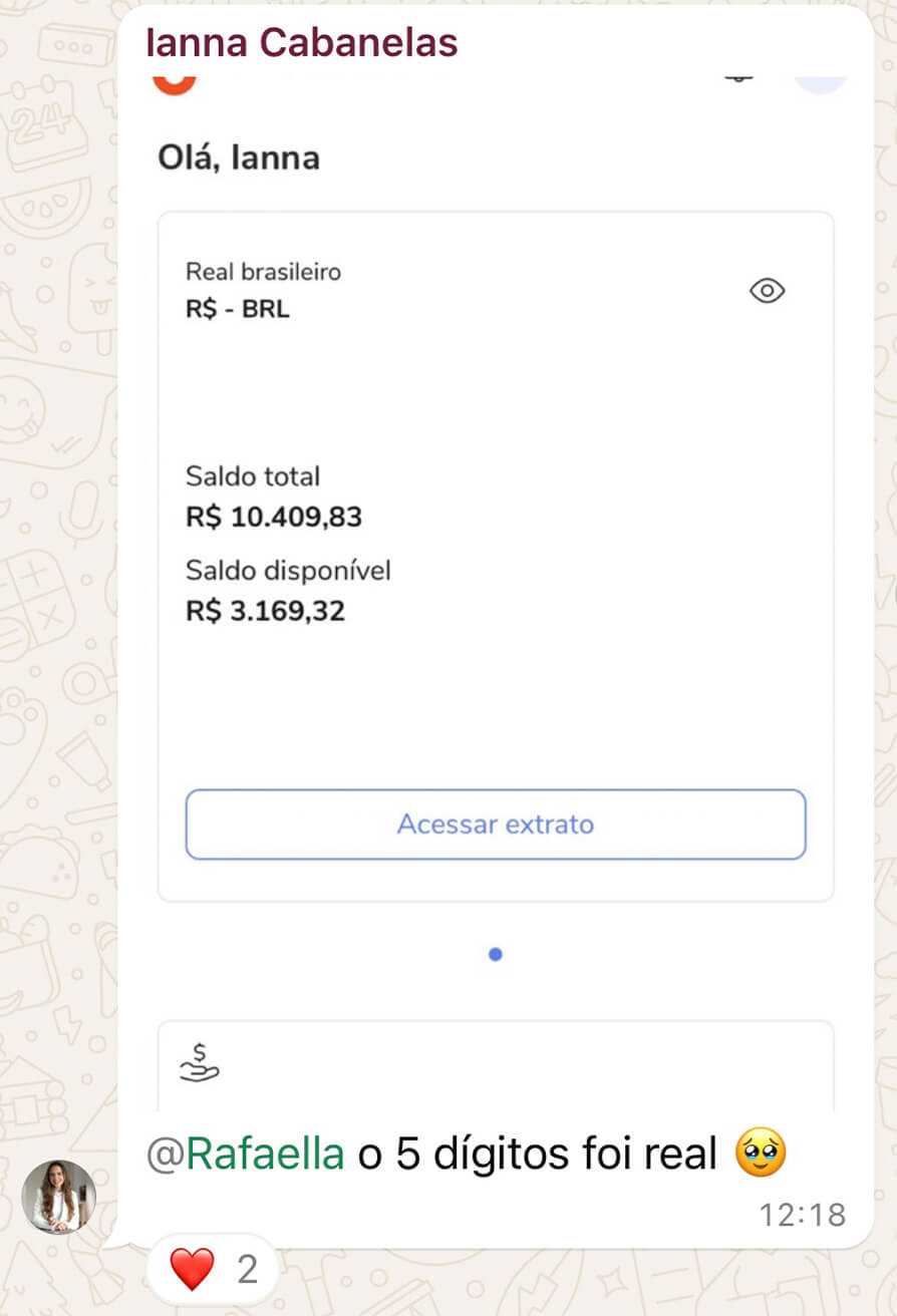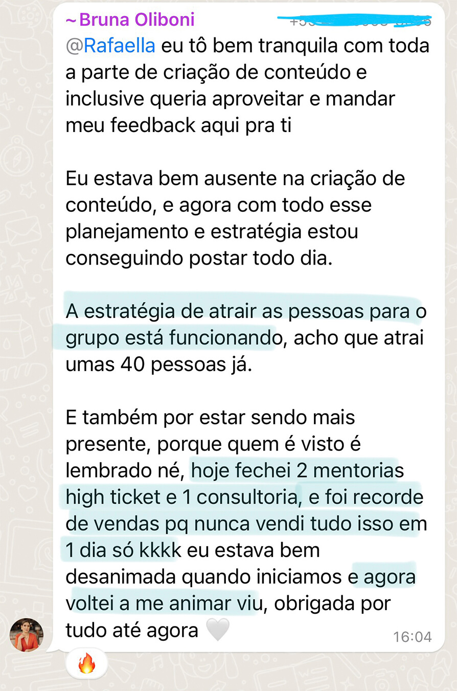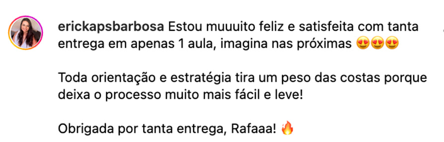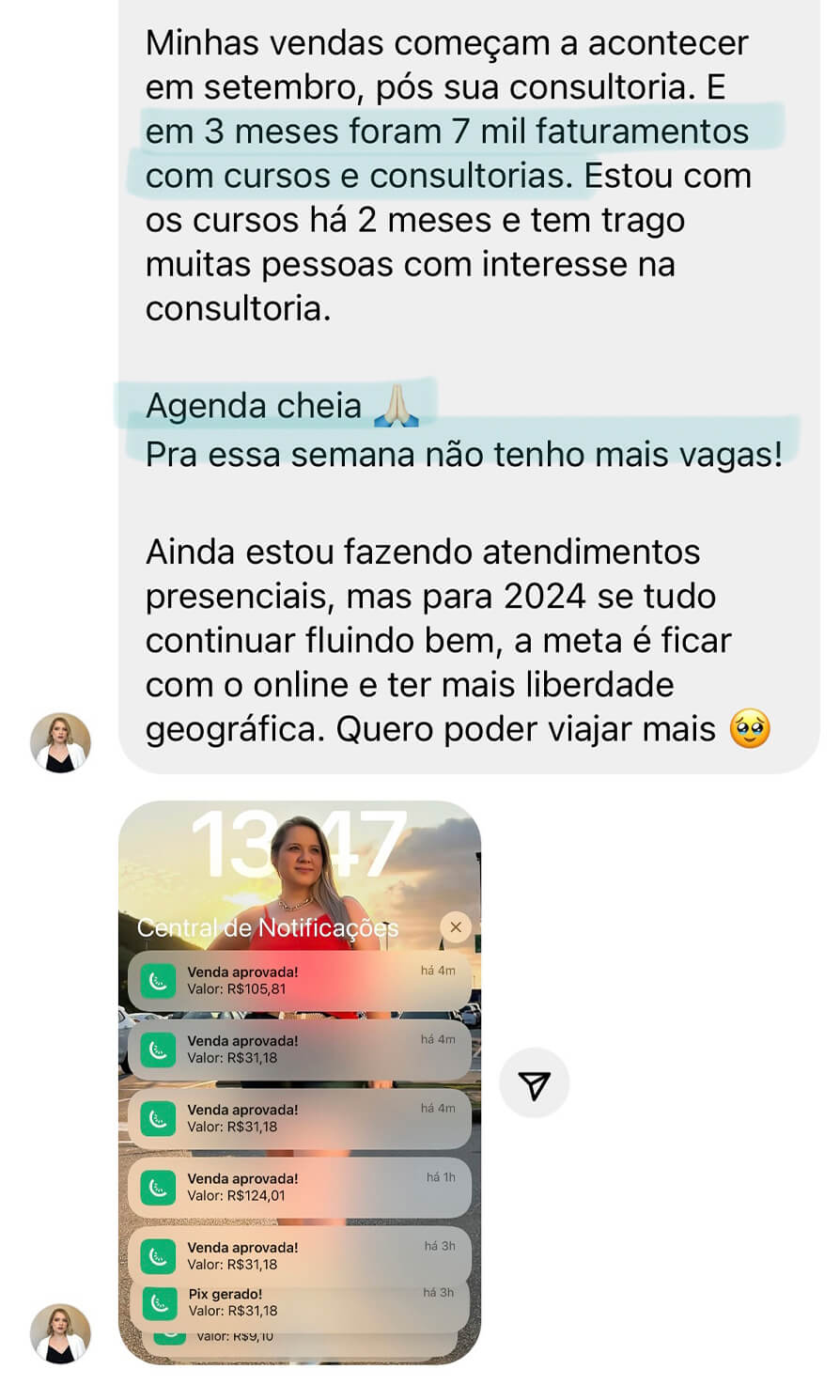 Já essa aluna lotou a agenda da sua prestação de serviços e ainda segue faturamento algo com seus infoprodutos.
