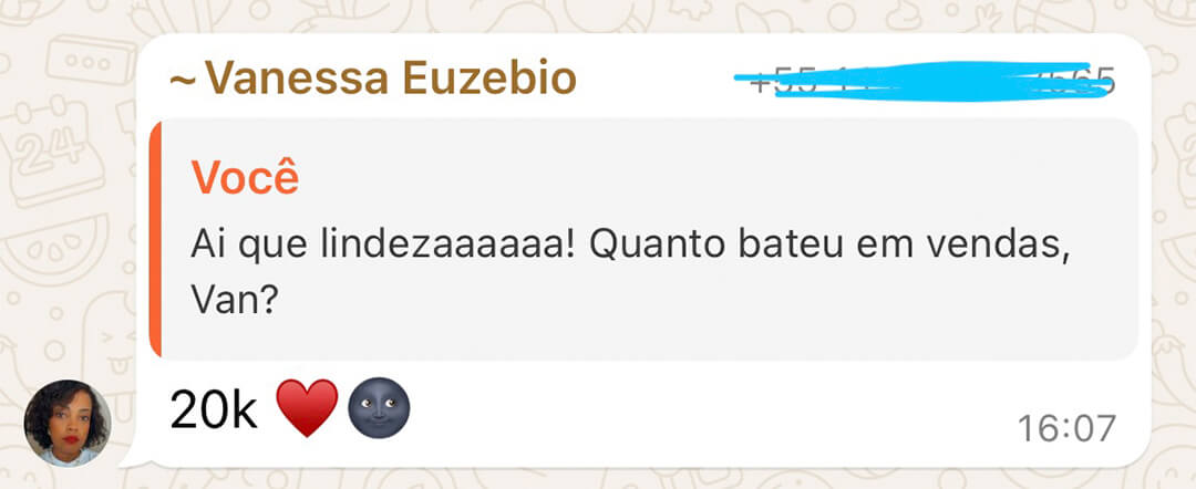 Comunidade exclusiva dos alunos no Whatsapp, com rotinas de engajamento e estratégias de vendas que, conforme eu aplico no dia a dia, compartilho por lá.